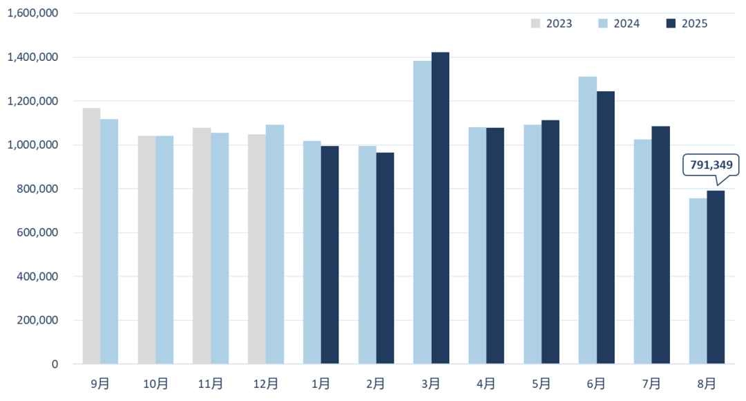 市場總量:8月歐洲乘用車新車注冊量為791,349輛,同比去年增長4.7%。截至8月底,2025年歐洲乘用車新車注冊量達(dá)到8,691,840輛,同比2024年上升0.4%。