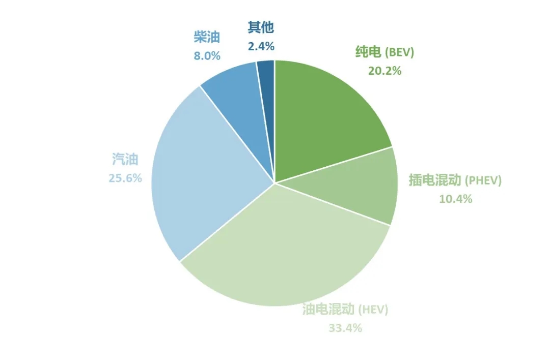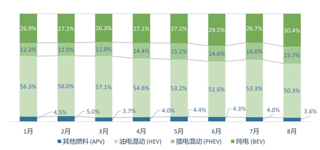 非傳統(tǒng)能源結(jié)構(gòu)變化(2025.01-2025.08):8月純電(BEV)在所有非傳統(tǒng)能源的占比首次突破30%大關(guān),占比為30.4%。插混(PHEV)占比為15.7%, 與7月保持類似占比水平,混動(HEV)占比下降至50.3%。